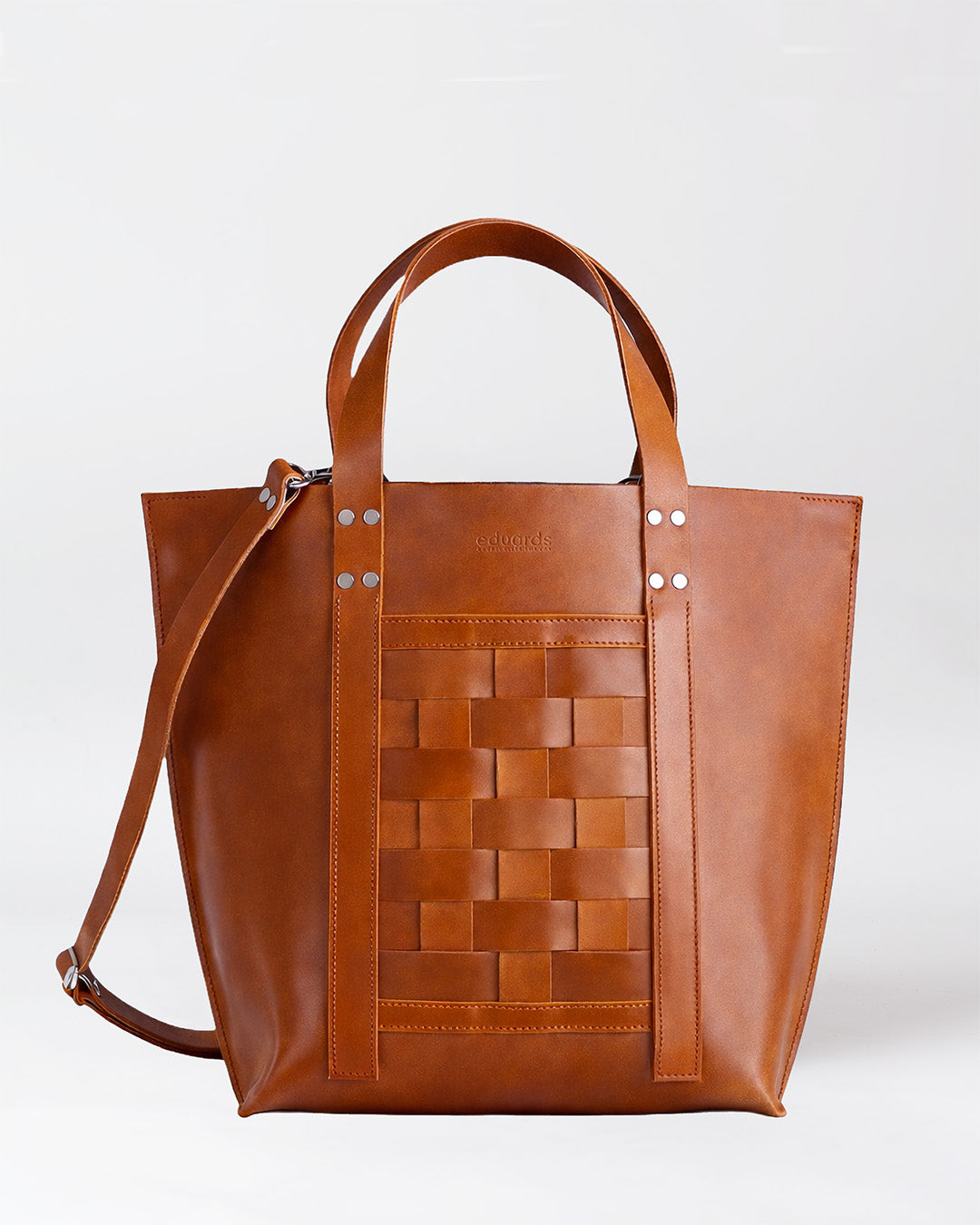 The tote features an outer pocket with Eduards’ signature braided leather pattern. It is unlined and closes with a double magnetic closure. Twin top handles and a detachable, adjustable shoulder strap allow it to be carried by hand, on the shoulder or crossbody.
