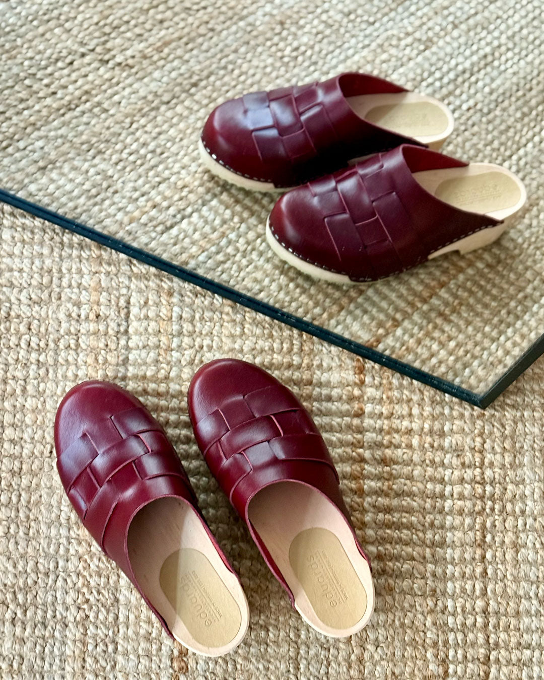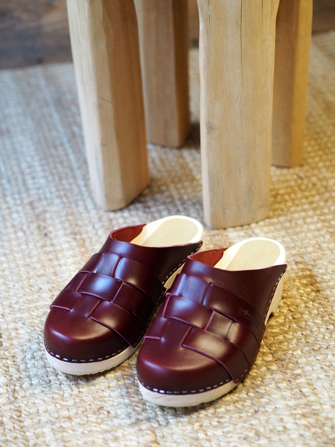 Vår låga träsko är en klassisk modell med generös vidd i foten för en bekväm passform. Lätt att bära och enkel att styla – perfekt för allt från lediga sommardagar till denim och mer dressade looks. Den flätade ovandelen, med breda läderremmar, ger skon en distinkt karaktär som knyter an till Näverkollektionens signaturdesign.